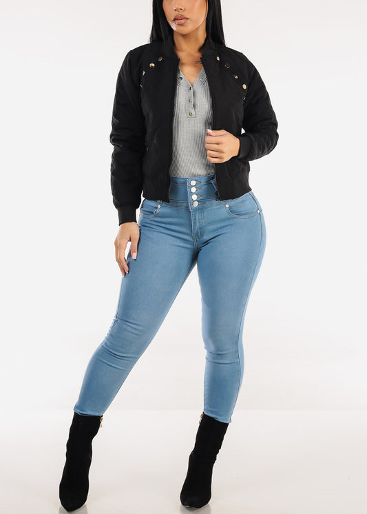 Long Sleeve Half Button Up Stretch Ribbed Top Grey
