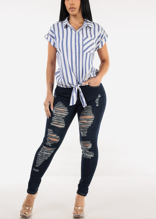 Stretchy Distressed Mid Rise Dark Skinny Jeans