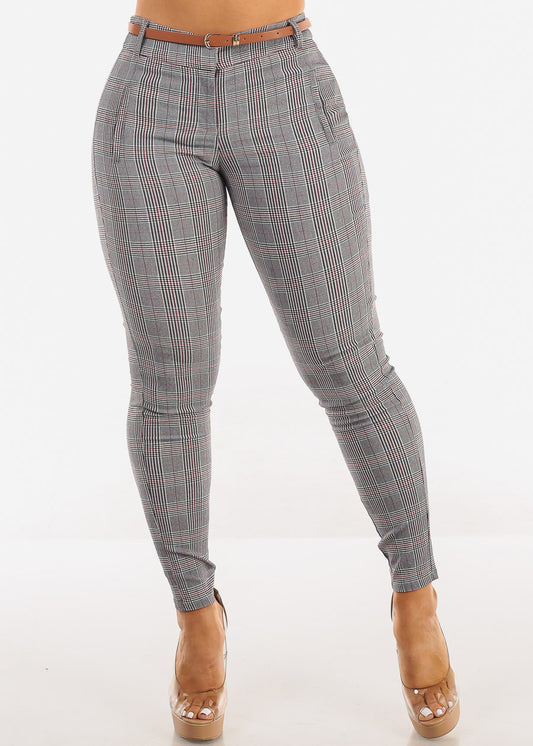 Butt Lift High Waist Plaid Skinny Pants w Belt