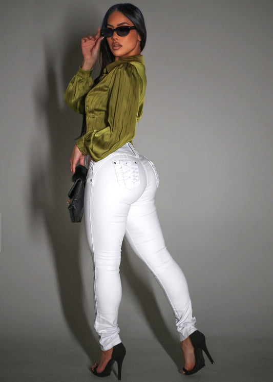 MX JEANS Braided Pocket Butt Lifting White Stretch Skinny Jeans