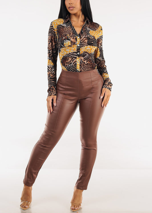 Long Sleeve Button Up Animal Print Mesh Blouse