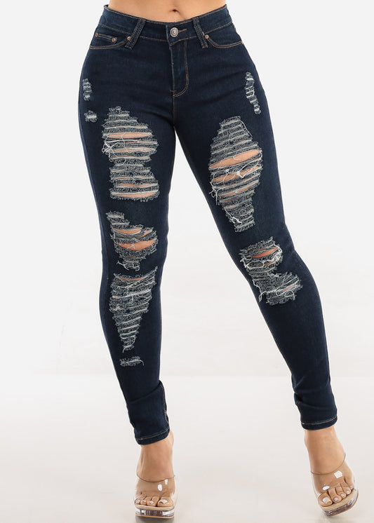 Stretchy Distressed Mid Rise Dark Skinny Jeans