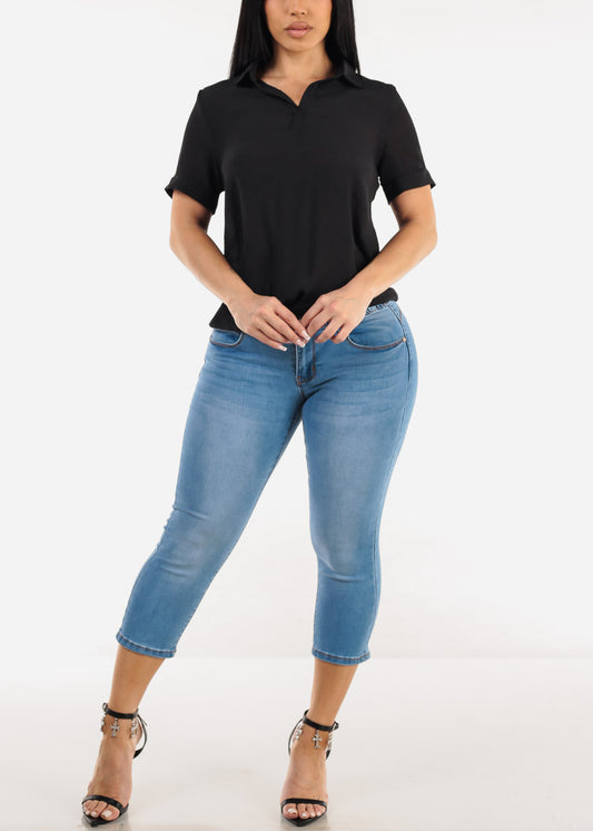 Black Short Sleeve Ribbed Top w Side Snap Cut Out