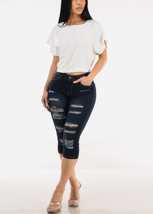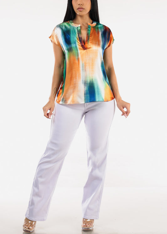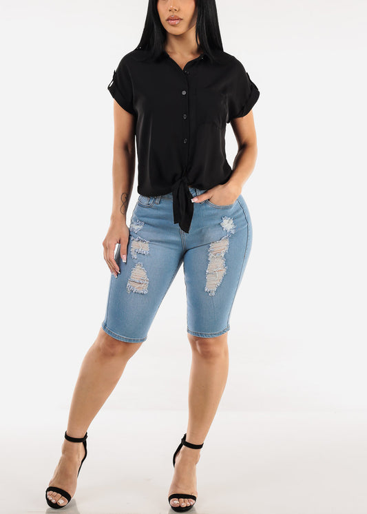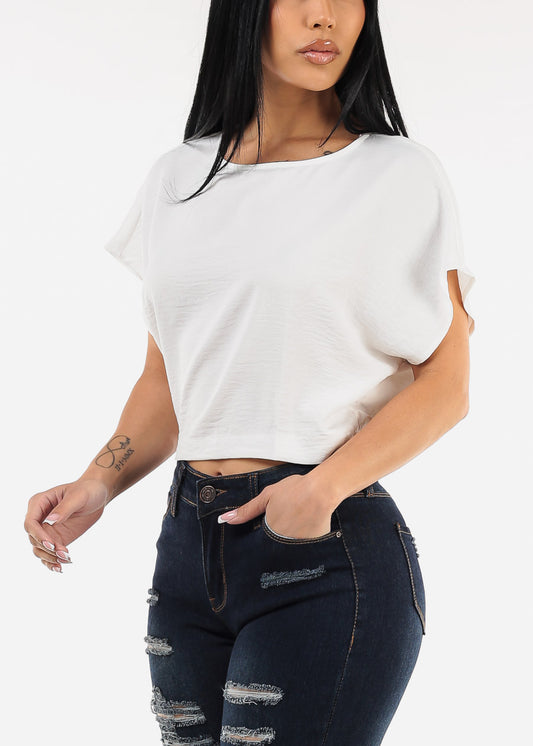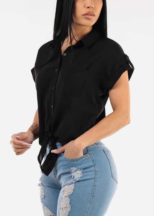 Short Sleeve White Blouse w Neck Tie Detail