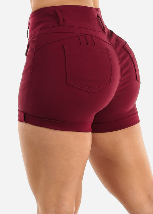 MX JEANS High Waist Hyper Stretch Butt Lifting Mid Thigh Shorts Burgundy