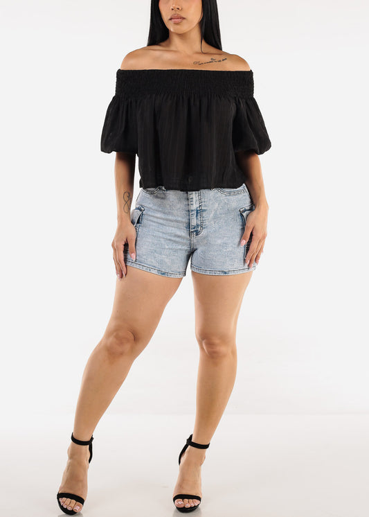 Butt Lift High Waist Stretch Cargo Denim Shorts Light Acid Wash