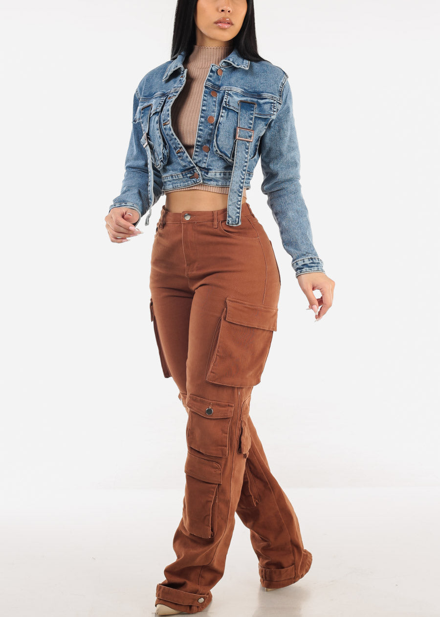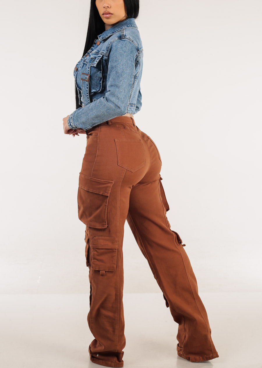 Butt Lift Straight Wide Leg Cargo Jeans Brown