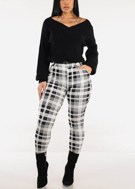 Butt Lift Stretchy Plaid Skinny Ankle Pants White & Black