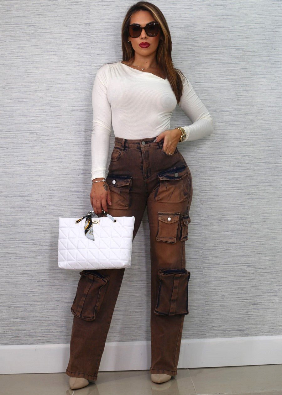 High Waist Acid Wash Utility Cargo Jeans Brown