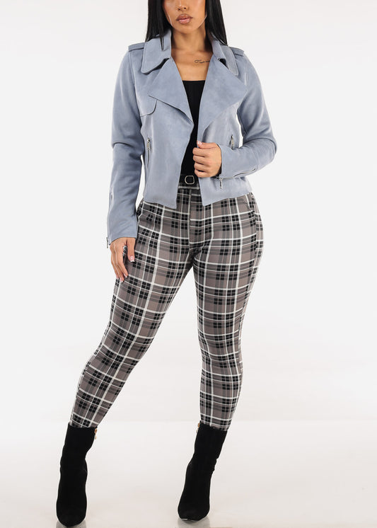 Long Sleeve Open Front Suede Moto Jacket Dusty Blue
