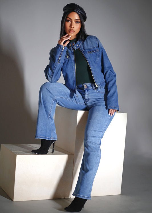 Long Sleeve Zip Up Denim Jacket Med Wash