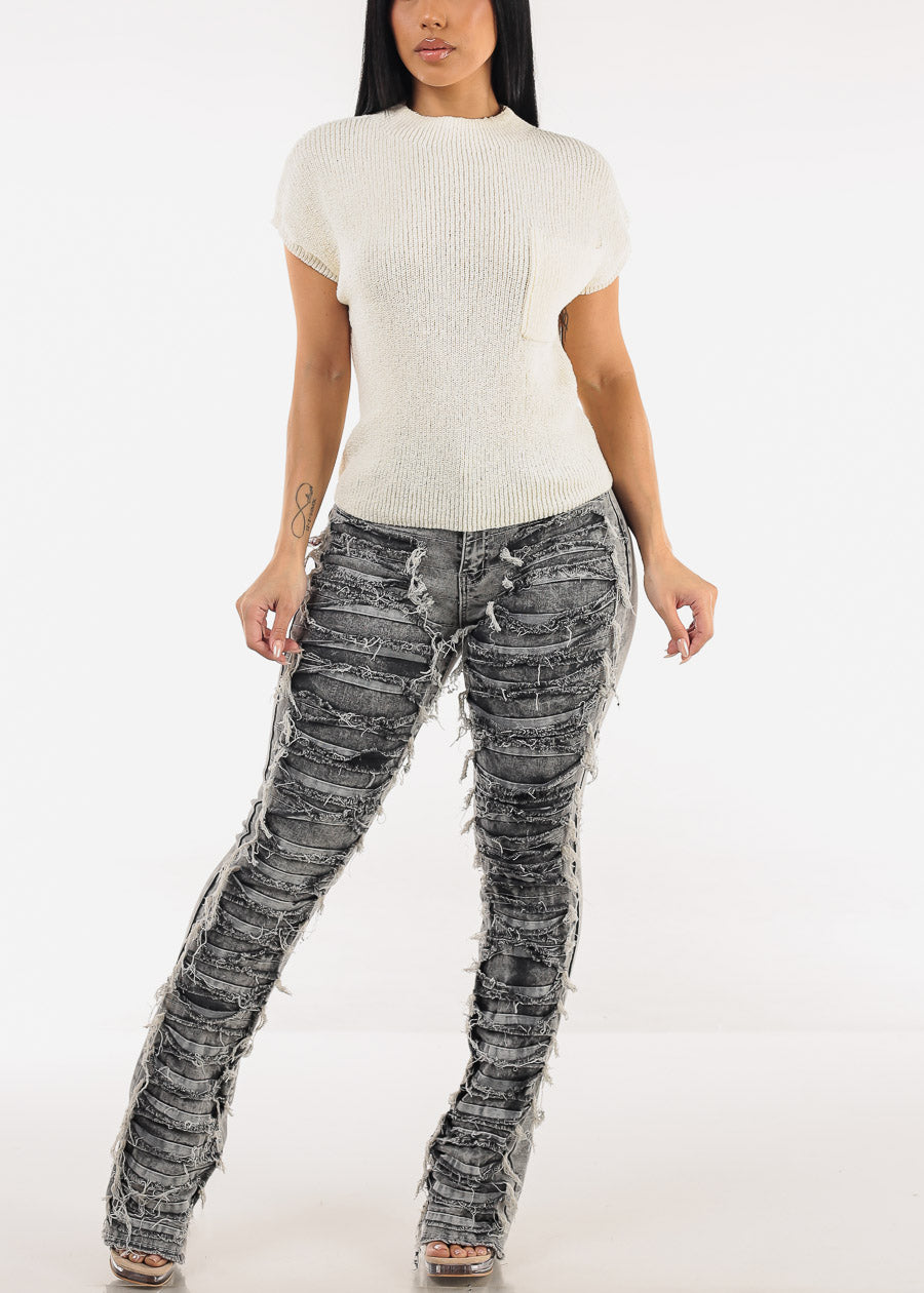 High Waist Ultra Distressed Stacked Leg Jeans Black Acid Wash