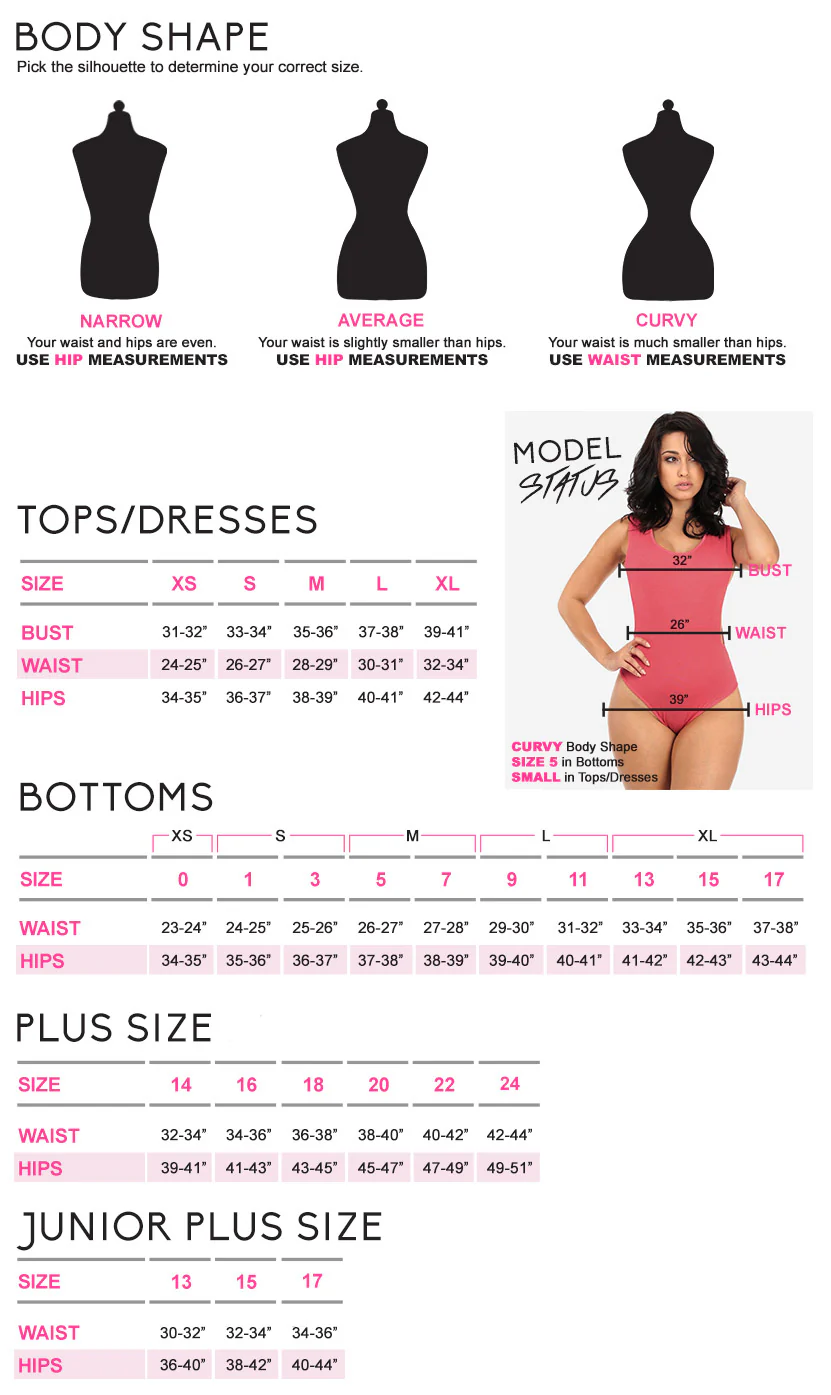 ModaXpress bottoms use junior sizing, which typically runs 1–2 sizes smaller than standard misses sizing. If you wear a size 10 in most brands, you will likely need a size 13 with us. We recommend checking our detailed size guide, which includes real customer hip measurements for each size. If you are between sizes, size down for a more sculpted feel or size up for a relaxed fit. Not sure? Contact our fit team — we have been helping women find their size for over 20 years.