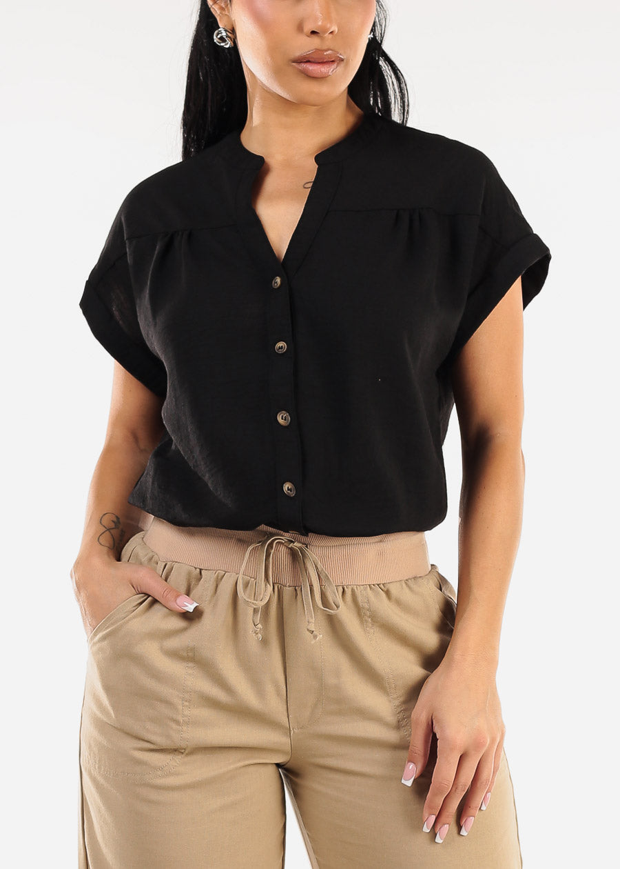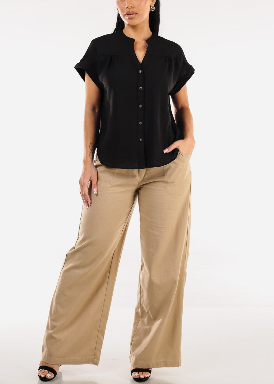 Short Sleeve Button Up Linen Blouse Black